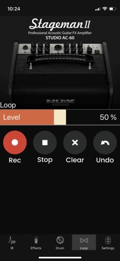 Stageman II AC-60 jest wyposażony w 8 plików IR. Każdy z nich jest zoptymalizowany pod kątem rodzaju gitary i typu przetwornika. Nazwy plików IR są zawarte w profilu gitary, zoptymalizowanym typie gitary i typie przetwornika. Połącz Stageman II AC-60 z telefonem komórkowym (aplikacją), aby włączyć/wyłączyć funkcję IR.
