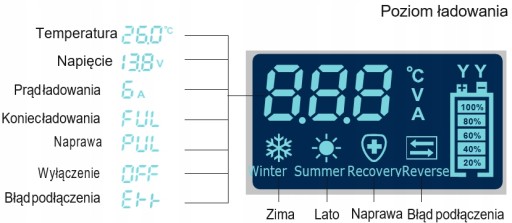 Urządzenie automatycznie wykrywa, temperaturę otoczenia i dobiera odpowiednie napięcie ładowania w zależności od temperatury otoczenia ( tryb letni i tryb zimowy). W przypadku trybu zimowego - napięcie ładowania jest minimalnie wyższe.