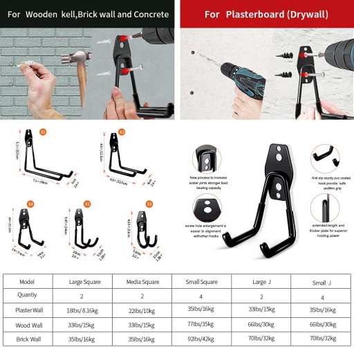 14 sztuk haczyków ciennych do duych obcień zamiast wikszoci 2 punktów spawania i dugoci 3 h haków garaowych z tyu oraz przeduon dugo dziki czemu mona atwo przenosi i utrzyma due obcienia. Podwójny hak moe osign wiksz si i stabilno. Haki utrzymuj ciar maks. Do ok. 40 kg. Zestaw haków ciennych koniec z chaosem Zaawansowana technologia antypolizgowej powoki PCW chroni urzdzenia powierzchni aby unikn rdzy i zarysowań. Nadaje si do garau sklepu piwnicy szopy. Idealnie nadaje si do opatek drabin roweru mioty opon urzdzeń ogrodowych wa powietrza narzdzi do trawnika. Wielofunkcyjne haki cienne do garau 14 sztuk haczyków garaowych w 5 rónych rozmiarach 4 x may hak w ksztacie litery U 2 x redni hak w ksztacie litery U 2 x duy hak w ksztacie litery U 4 x may hak J 2 x duy hak J. Róne rozmiary mog dostosowa do wszystkich systemów porzdkowania. Utrzymuje róne urzdzenia i narzdzia w porzdku hak garaowy moe zaoszczdzi wicej miejsca. atwy monta i uytkowanie haczyki do przechowywania garaowego nadaj si do cian gipsowych drewnianych i ceglanych a materiay montaowe 28 rub i 56 koków s równie poczone. Zaznaczy i wywierci otwór a nastpnie woy koki do otworu na koniec naley zamontowa haki garaowe za pomoc rub. Po montau mona bez problemu wkada i wyjmowa narzdzia. 3godzinny zespó wsparcia 12miesiczna gwarancja jakoci i wsparcie techniczne. Jeli masz jakiekolwiek pytania postaramy si jak najlepiej pomóc. Dziki zaawansowanemu procesowi i najwyszym standardom produkujemy dug ywotno i lepsz jako haków garaowych.