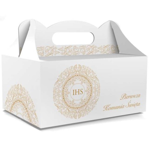 Ozdobne pudełko w kolorze BIAŁYM na CIASTO KOMUNIJNE. Pudełko posiada nadruk złotej HOSTII IHS a także napis PIERWSZA KOMUNIA ŚWIĘTA. Boki pudełka zdobione są złotymi ornamentami. Pomyśl jak pięknie i gustownie będzie wyglądało ciasto wręczane w takim pudełku. W zestawie znajduje się 5 sztuk pudełek.
