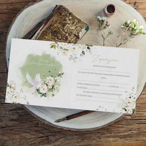 - nadruk: matowy, grafika gołębia w otoczeniu kwiatów piwonii na białym tle, a także napis Bierzmowanie Zaproszenie