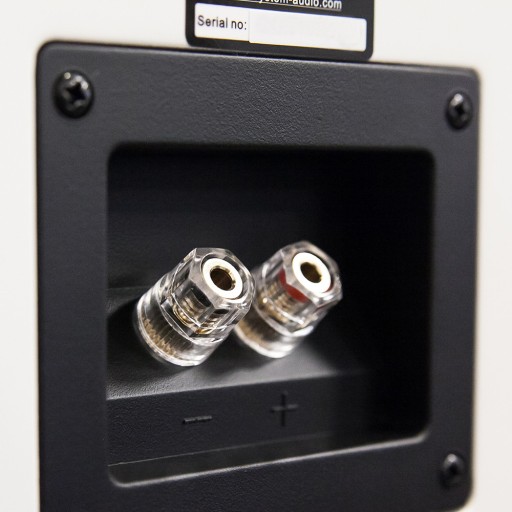 Wykończenie obudowy to prawdziwie błyszczący lakier w kolorze białym lub czarnym, a z przodu tkanina pokrywająca maskownicę, która chroni głośniki. Możesz kupić maskownicę w innym kolorze niż kolumna jako opcja.
