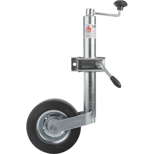Stalowe koło podporowe do przyczepy w zestawie z kompatybilną obejmą firmy Unitrailer do przyczepy. Średnica rury wynosi 48 mm.