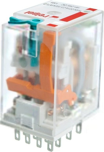 R4N-2014-23-5048-WTL Przekaźnik elektromagnetyczny, przemysłowy - miniaturowy, do gniazda wtykowego. Szerokość 21,2 mm. Wyjście: 4P - cztery zestyki przełączne - wyprowadzenia: 11(9), 12(1), 14(5), 21(10), 22(2), 24(6), 31(11), 32(3), 34(7), 41(12), 42(4), 44(8), AC1 - 6 A / 250 V, DC1 - 6 A / 24 V. Wejście / cewka - wyprowadzenia: A1(13) - A2(14), napięcie zasilania Un - 48 V AC. Wskaźnik mechaniczny W, wskaźnik LED czerwony L, przycisk testujący T z funkcją blokowania. Wymiary: 27,5 x 21,2 x 35,6 mm. IP 40. Materiał styków: AgNi. Wymiary zestawu R4N + gniazdo wtykowe + obejma: wskazane są w opisie wybranego gniazda.