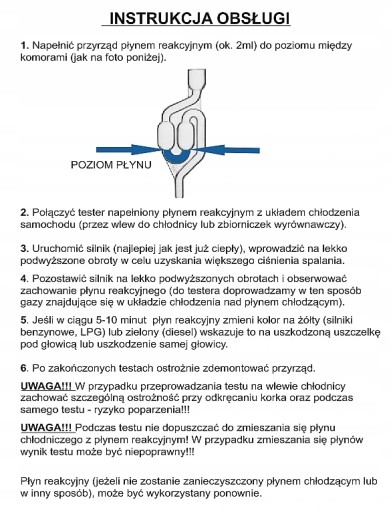W przypadku uszkodzonej uszczelki pod głowicą lub samej głowicy część gazów spalinowych, zawierających m.in. CO2 trafia do układu chłodzenia. Zasada działania przyrządu opiera się na pomiarze stężenia CO2 - w przypadku zwiększonego stężenia płyn reakcyjny wchodzi w reakcję z CO2 i zmienia swoją barwę.