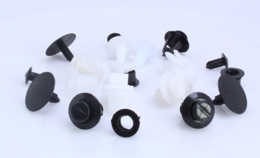- Zestaw 12 różnych typów klipsów, w tym klipsy mocujące, zatrzaski, przelotki, klipsy ustalające, klipsy do listewek.