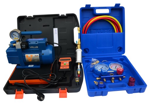 Łopatkowa pompa próżniowa jednostopniowa z wakuometrem V-i120SV do wytwarzania próżni zarówno w układach klimatyzacyjnych stacjonarnych jak i samochodowych. Pompa tworzy podciśnienie w szczelnych zbiornikach (układach), poprzez "wysysanie" znajdujących się w nich gazów. Obudowa aluminiowa jest lekka i wytrzymała, a praca pompy cicha i płynna. Hałas eliminuje elastyczne połączenie umieszczone pomiędzy silnikiem i modułem. Pompa próżniowa zaopatrzona jest w system smarujący zaprojektowany do dostarczania czystego, przefiltrowanego oleju do wszystkich wewnętrznych łożysk i powierzchni zużywających się, niezależnie od ciśnienia operacyjnego pompy.