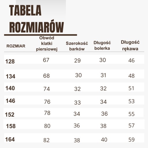 Poniżej znajduje się tabela rozmiarów dzięki której dopasujecie Państwo odpowiedni rozmiar bolerka dla swojego dziecka.