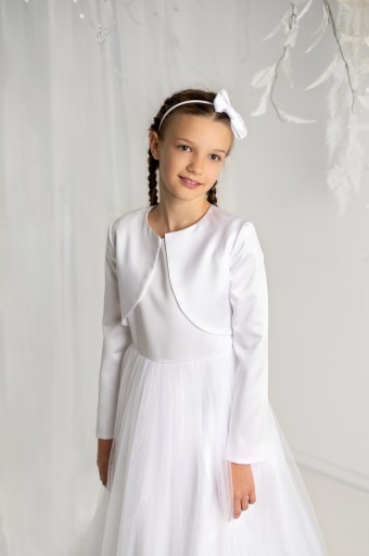Eleganckie i klasyczne bolerko komunijne z świetniej jakości atłasu ślubnego, dzięki swojemu uniwersalnemu stylowi świetnie pasuje do każdej sukieneczki komunijnej. Długi rękawek idealnie sprawdzi się na chłodniejsze dni, zwłaszcza do sukienek z krótkim rękawkiem. Z pewnością przyda się zarówno na ceremonii Komunii Świętej jak i na biały tydzień. Bolerko świetnie się układa zarówno na sukienkach komunijnych jak i na albach.