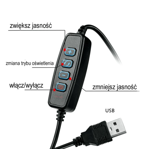 - RING LED 30 cm (12”) - lampa pierścieniowa na USB, ze ściemniaczem i regulacją barwy (temperatury) światła