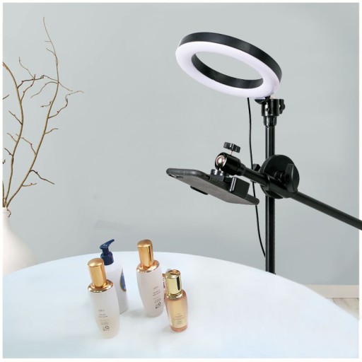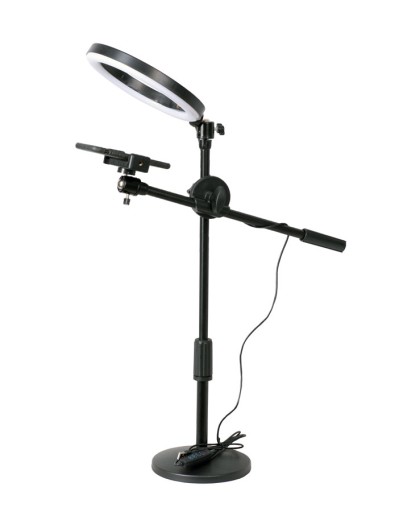 Zestaw składa się z kompaktowej, lekkiej lampy pierścieniowej (RING) o średnicy 30 cm oraz regulowanego statywu z ramieniem typu boom, z uchwytem na telefon.