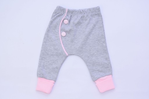 ✅ Szare spodnie dresowe z różowymi ozdobnymi guzikami. W pasie guma, nogawki zakończone delikatnymi ściągaczami, które można wywijać.Materiał: 100% BAWEŁNA