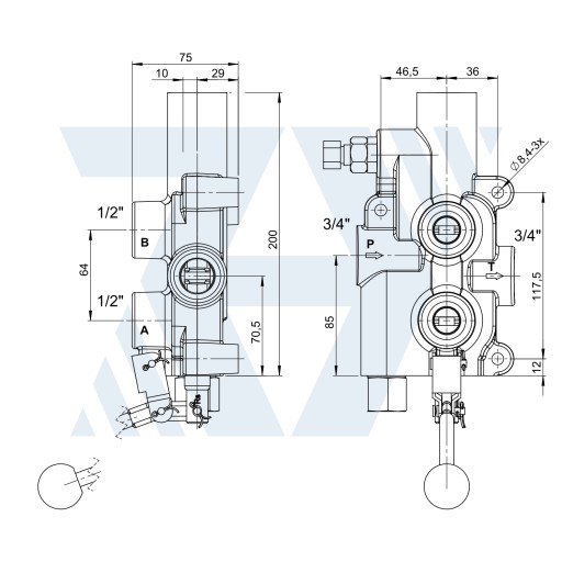 🔵 Gwinty przyłączeniowe, zasilanie P: 3/4" BSP,