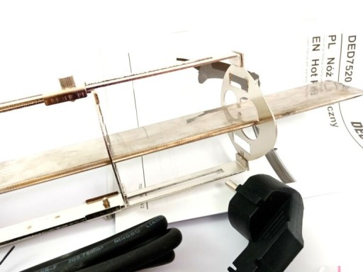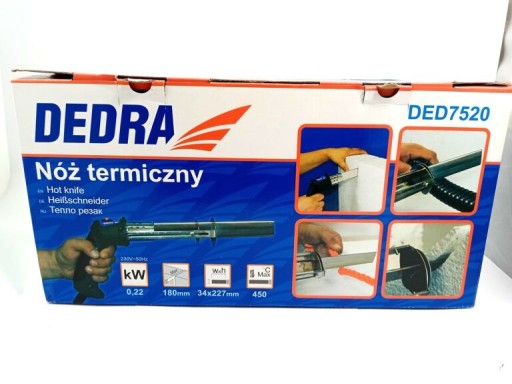 Nóż termiczny do styropianu 220W max temp 4500CDane techniczne:Napięcie zasilania 220/240 V, 50HzMoc max. 220WMasa ~1,5 kgMax. temperatura nagrzewania dla 220W ~450°CIlość nastaw temperatury 5Temperatury nastaw 70/150/275/380/450°CMax. czas osiągnięcia temperatury ~450°C ~5minElektryczna klasa ochronności urządzenia - IDługość całkowita noża: 22cmDługość robocza: 14 cm