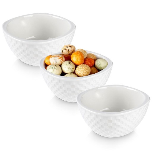 ✅ PORCELANOWE - Zestaw trzech miseczek na przekąski wykonanych z porcelany w białym kolorze, posiadają efektowny wzór. Połączenie minimalizmu z nowoczesnym designem. Każda z miseczek ma wymiar 9,5 x 9,5 x 4,5 cm i pojemność 160 ml.
