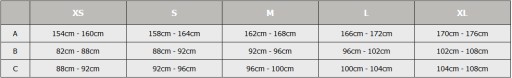 A - wzrost | B - obwód klatki piersiowej | C - obwód bioder