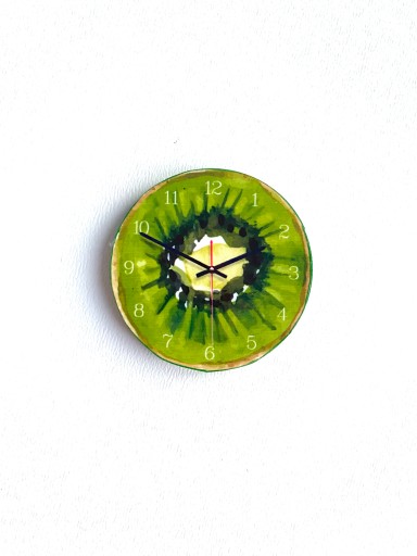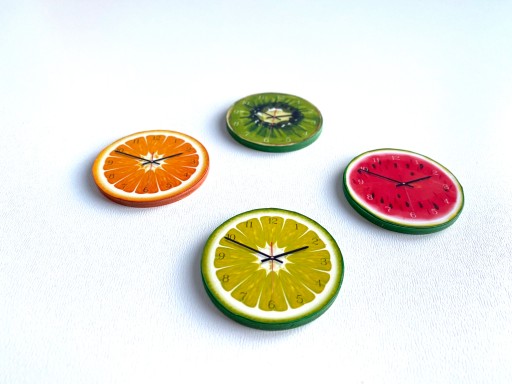 Ręcznie robiony miniaturowy zegar ścienny z tarczą w kształcie owocu (arbuz, kiwi, limonka, pomarańcz), idealny do domków dla lalek, do pokoi dziecięcych, szkoły, kuchni, salonu itp. Tarcza wydrukowana jest na papierze fotograficznym, pokryta taśmą klejącą w celu zapobiegnięcia uszkodzeniom, naklejona na drewniany krążek pokryty zieloną lub pomarańczową farbą olejną.