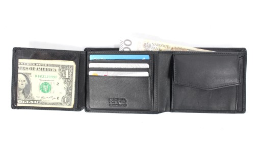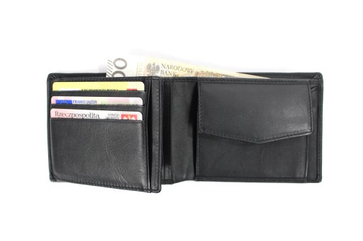 Portfel nie posiada zapięcia, co zapewnia szybki dostęp do jego wnętrza. Wewnątrz znajduje się kieszonka na monety zapinana na zatrzask, 6 miejsc na karty oraz jedno okienko ID. W portfelu znajdziemy także 2 przegrody na banknoty, które można wkładać w całości, bez konieczności składania oraz 3 dodatkowe, płaskie kieszonki.