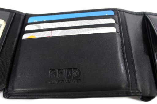 W portfelu znajduje się ochrona RFID. Jest to system, który zabezpiecza karty płatnicze przed kradzieżą środków jak i dokumenty biometryczne przed odczytaniem danych. Warto zadbać o bezpieczeństwo swoich dokumentów i zdecydować się na kupno portfela z zabezpieczeniem.