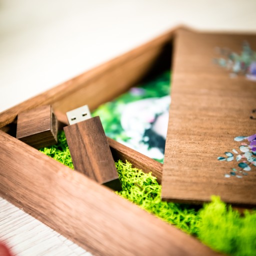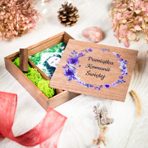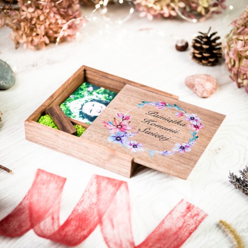 Drewniane pudełko na zdjęcia + kolorowy nadruk UV na pudełku + Pendrive 32 GB USB 2.0 + Grawer