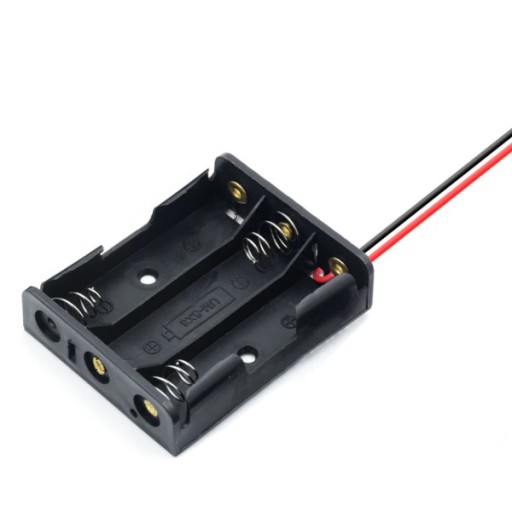 Koszyczek z przewodami na 3 akumulatory lub baterie typu R6/AA bez wyprowadzonych przewodów. Zastosowanie np. do zasilania odbiornika w modelach.Koszyk na baterie ma formę niewielkiego otwartego pudełka z wydzielonym miejscem na baterie.