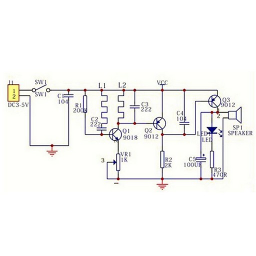 Zestaw DIY KIT (do zalutowania) do budowy wykrywacza metali. Wykrywa elementy w odległości 6 centymetrów. W zestawie znajdują się wszystkie elementy do zbudowania wykrywacza, prócz pojemnika na baterie i obudowy.