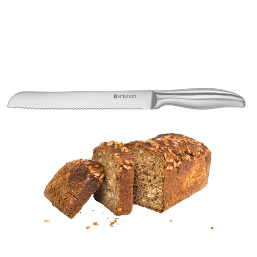 Nóż do pieczywa z kolekcji Maestro firmy Ambition - lekkie i wygodne narzędzie. Wykonany z wysokiej jakości stali nierdzewnej ✨. Posiada wyprofilowaną rękojeść o gładkim i matowym wykończeniu 💪. Nóż pasuje do bloku na noże z tej samej kolekcji 🔪🔗. Dzięki ząbkowanemu ostrzu nóż poradzi sobie z nawet mocno przypieczoną skórką chleba, bułkami czy innym pieczywem 🍞👌.