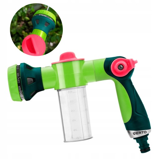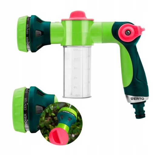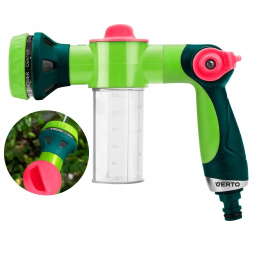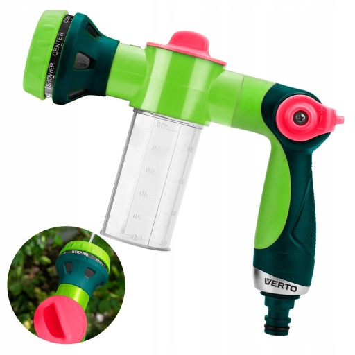 Zraszacz pistoletowy z pojemnikiem, opryskiwacz piany 15G715 marki VERTO to narzędzie z wbudowanym pojemnikiem oraz opryskiwaczem piany, wyposażone w 8-funkcyjną, płynną regulację strumienia. Sterowanie za pomocą kciuka, umożliwia szybki wybór rodzaju strumienia, jego siły i funkcjonalności. Czytelne oznakowanie na zraszaczu ułatwia wybranie odpowiedniego programu i jego dobór do aktualnych potrzeb. Narzędzie posiada dwumateriałowy, ergonomiczny uchwyt, umożliwiający długotrwałą pracę. Zraszacz pistoletowy polecany jest do nawadniania, ale również czyszczenia mebli ogrodowych czy mycia samochodu. Jego uniwersalne zastosowania sprawdzą się zarówno w profesjonalnym jak i przydomowym środowisku.