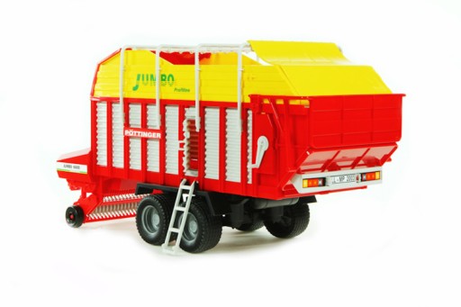 Bruder 02214 to wiernie odwzorowana przyczepa samozbierająca Pottinger Jumbo 6600 Profiline w skali 1:16. Zabawka ta jest w pełni kompatybilna z traktorami marki Bruder. Bardzo ciekawa przyczepa dzięki swoim funkcjom takim jak podnoszona przednia podpora pionizująca maszynę, gdy ta nie jest podłączona do ciągnika, wysuwane przednie koła z mechanizmem zbierającym, umieszczone z tyłu przyczepy wały wygarniające, którymi sterujemy przy pomocy niewielkiej korby, wysuwana drabinka prowadząca do uchylanych drzwi, znajdujących się w bocznej burcie.