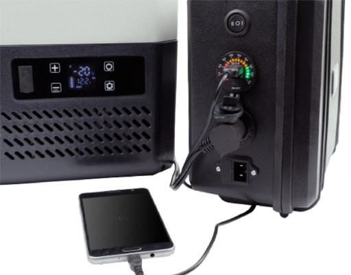 - gniazdo typu IEC C12 z bezpiecznikiem 15A - zasilanie / ładowanie akumulatora zasilaczem z wtyczką C11 (np akumulatora żelowego 12 V - zasilaczem ze standardowego wyposażenia wielu popularnych modeli turystycznych lodówek kompresorowych | zasilacz - ładowarka dostępny również oddzielnie: np poprzez "kup w zestawie")