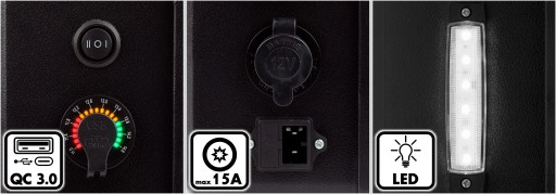 - panel gniazd USB klasy QC 3.0 (quick charge) z klapką osłonową i włącznikiem: USB-A | USB-C do zasilania i szybkiego ładowanie urządzeń mobilnych: