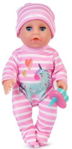 ⭐ Lalka ubrana jest w różowe body w białe paski oraz czapeczkę, która pasuje do kompletu! Na ubranku znajduje się również nadrukowany jednorożec!