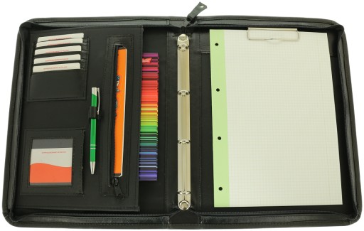- Etui posiada: kieszeń na dokumenty A4; kieszeń zamykana na zamek; 2 mniejsze kieszenie; 5 kieszeni np. na wizytówki; kieszen z okienkiem np. na zdjęcie; uchwyt na długopis; ring poczwórny na dokumenty; klip na dokumenty