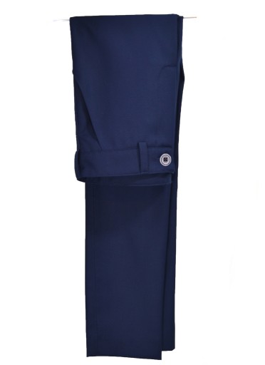 - spodnie granatowe z lekko zwężanymi nogawkami, bez zaprasowanego kantu, dół spodni podszyty bezszwowo,