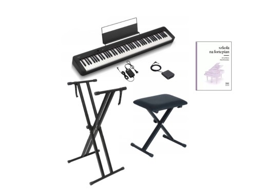 W skład zestawu wchodzą: pianino, zasilacz, pedał sustain, ława metalowa, statyw metalowy, Szkoła na fortepian