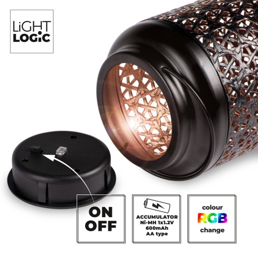 Stylowa latarnia metalowa emituje światło w kolorach RGB. Niskie zapotrzebowanie na energię z akumulatorów to pewność, że latarnia będzie emitowała subtelne światło przez wiele godzin, począwszy od zmroku.