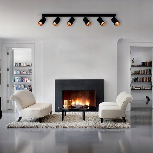 Listwa spot natynkowa 6 punktowa z możliwością regulacji położenia źródeł światła. Elementy metalowe wykończone w kolorze czarnym (pierścień w środku klosza w kolorze złotym). Oprawa posiada wszystkie niezbędne elementy do montażu i podłączenia, w tym gniazdka porcelanowe GU10. Lampę montuje się do ściany lub sufitu za pomocą dwóch kołków rozporowych które są częścią zestawu. Możliwość podłączenia lampy na dwa obwody świecenia poprzez zmianę kostki przyłączeniowej na 4 przyłącza i zmiany podłączenia przewodów, zalecamy aby modyfikację wykonał elektryk.