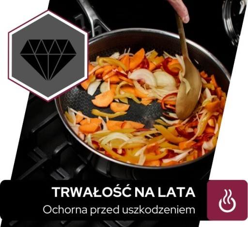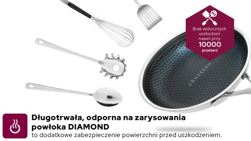 Długotrwała, odporna na uszkodzenia powłoka DIAMOND to dodatkowe zabezpieczenie powierzchni naczynia - pomaga chronić naczynie przed zarysowaniem, nawet podczas używania ostrych przyborów kuchennych, na przykład szpatułek, czy szorstkich gąbek do mycia. Niebieska poświata na powierzchni naczynia to widoczna oznaka tej wyjątkowej ochrony. Powłoka DIAMOND jest odporna na ścieranie i zapewnia ochronę na długi czas - nawet do 10000 przetarć. Ponadto, wypustki ze stali nierdzewnej tworzące wzór plastra miodu tworzą niewielkie „kolumny”, na których opierają się przybory kuchenne podczas mieszania potrawy, co stanowi pierwszy bufor zabezpieczający powłokę zapobiegającą przywieraniu.