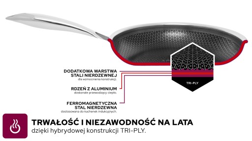 Efektem jest niezwykła trwałość i odporność na odkształcenia, dzięki czemu posłużą na długie lata. Największą zaletą warstwowej konstrukcji jest efektywne przewodzenie i utrzymanie ciepła. Warstwa stali nierdzewnej posiada właściwości magnetyczne, świetnie spisze się zatem także na kuchenkach indukcyjnych.