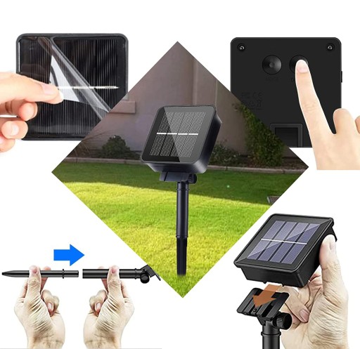 3. i 4. ✅ Do lampy dołączone są elementy pozwalające w łatwy sposób na zamocowanie panelu w ziemi. Brak konieczności stosowania kabli elektrycznych sprawia, że montaż jest szybki i bezproblemowy. Należy zwrócić uwagę, aby panel był wbity w ziemię w miejscu, do którego docierają promienie słoneczne.
