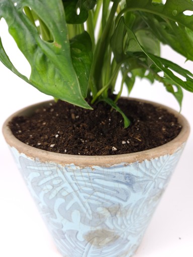 5️⃣ Wkładamy roślinę (powinna rosnąć na tej samej głębokości) i wypełniamy doniczkę ziemią do roślin zielonych do 2 cm poniżej krawędzi