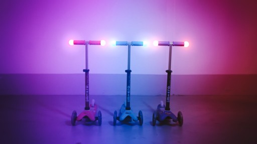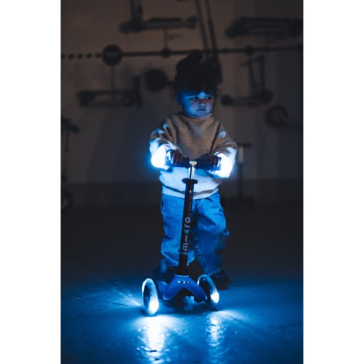 Hulajnoga posiada dwa przednie kółeczka z diodami LED świecącymi podczas jazdy oraz ledowe światełka na kierownicy,