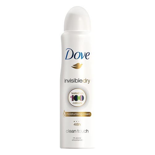 Udowodniono, że Dove Invisible Dry Antyperspirant Spray nie zostawia białych śladów na 100 kolorach. Dzięki 0% zawartości alkoholu, pomaga ograniczyć podrażnienia skóry. Zapewnia ochronę przed potem do 48 godzin. Zawartość ¼ kremu nawilżającego zapewnia niezwykłą miękkość i gładkość skóry pod pachami. Łagodzi podrażnienia delikatnej skóry pod pachami, spowodowane goleniem. Pozostawia skórę pod pachami bardziej miękką i gładką już po 3 dniach stosowania