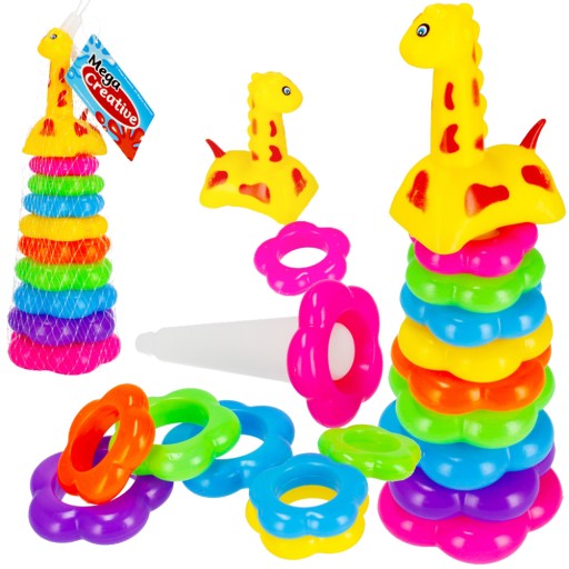 Zabawa polega na wkładaniu na plastikowy pal 9 różnokolorowych obręczy. Obręcze wykonane są w różnych rozmiarach, należy układać je od największego do najmniejszego. Na samym czubku znajduje się Żyrafa.