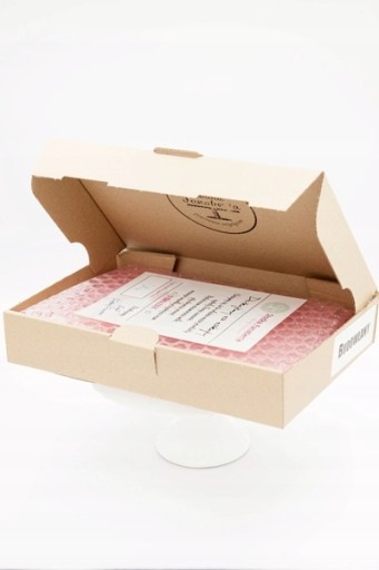 Poszczególne elementy ułożone są na sztywnej podkładce i ciasno zawinięte spożywczą folią stretch, kilkoma warstwami folii bąbelkowej, a całość umieszczona w estetycznym tekturowym kartoniku.