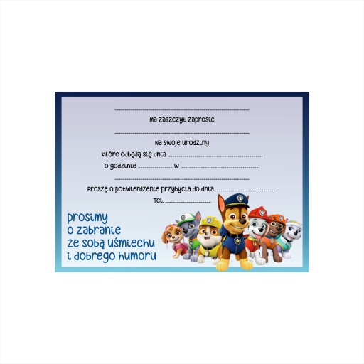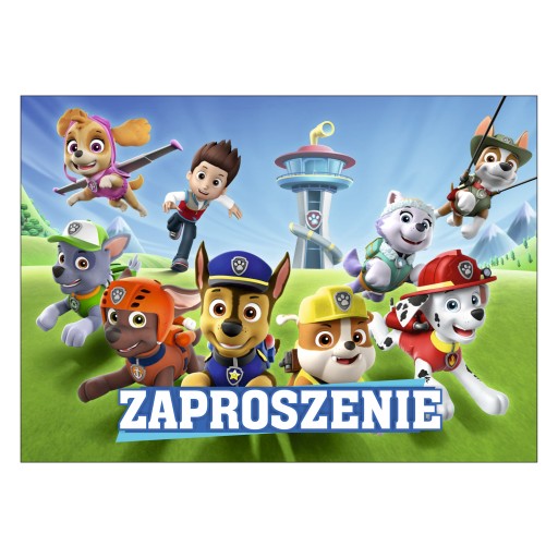 - Przepiękna kolorystyka zaproszenia, na przedniej stronie motyw Psi Patrol.