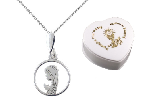 Zestaw składający się z medalika z Matką Boską Fatimską na łańcuszku typu ankier. Całość w ozdobnym pudełku okolicznościowym lub uniwersalnym. Idealny zestaw dla dziewczynki na I Komunię Świętą.