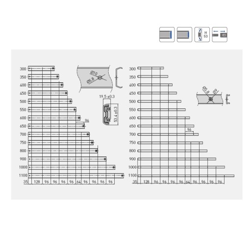Istnieje możliwość zamówienia prowadnic o długościach: 300, 350, 400, 450, 500, 550, 600mm.