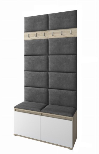 Funkcjonalny zestaw składający się z szafki na obuwie, miękkiego siedziska oraz ścianki tapicerowanej z wieszakami zapewni wygodę i komfort.