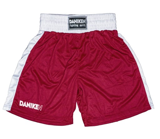 Spodenki bokserskie Daniken - Mesh - czerwone Klasyczny model spodenek. Biały, szeroki 7,5 cm pas z gumą i sznurkiem umożliwiający pełną swobodę ruchu. Wykonane z leistego, przyjemnego materiału typu mesh. Materiał jest przewiewny i zapewnia komfort użytkowania. Na jednej nogawce haft z logo producenta. Cechy produktu: SKŁAD: 100% poliester MATERIAŁ: lekka satyna umożliwiająca pełną swobodę ruchów. DESIGN: klasyczny design odpowiedni do codziennego treningu i na zawody sportowe. Jak dobrać rozmiar? Rozmiar Pas / Max Wysokość gumy w pasie Długość nogawki od pasa Długość od pasa do kroku S 31 / 47 cm 7,5 cm 39 cm 23 cm M 34 / 49 cm 7,5 cm 40 cm 27 cm L 35 / 51 cm 7,5 cm 46 cm 28 cm XL 39 / 56 cm 7,5 cm 51 cm 31 cm XXL 40 / 57 cm 7,5 cm 55 cm 33 cm